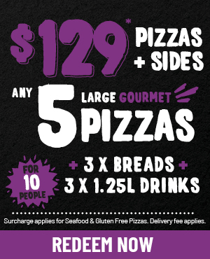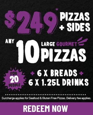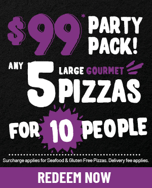 *Catering packs are not available with any other offer. Excludes ½ & ½. Surcharges apply for additional toppings, gluten free and seafood options. Sides up to $5.50 are included in the sides selection. Offer price is for pick up orders. Delivery orders incur an additional fee. 15% surcharge applies on Public Holidays. Please place catering orders 24 hours in advance. Pizzas ordered in a Catering pack do not count towards loyalty points.
